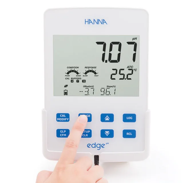 - Kalibrasi pH otomatis hingga 5 titik (mode standar) dengan 7 buffer standar Hanna dan 2 buffer kustom.
