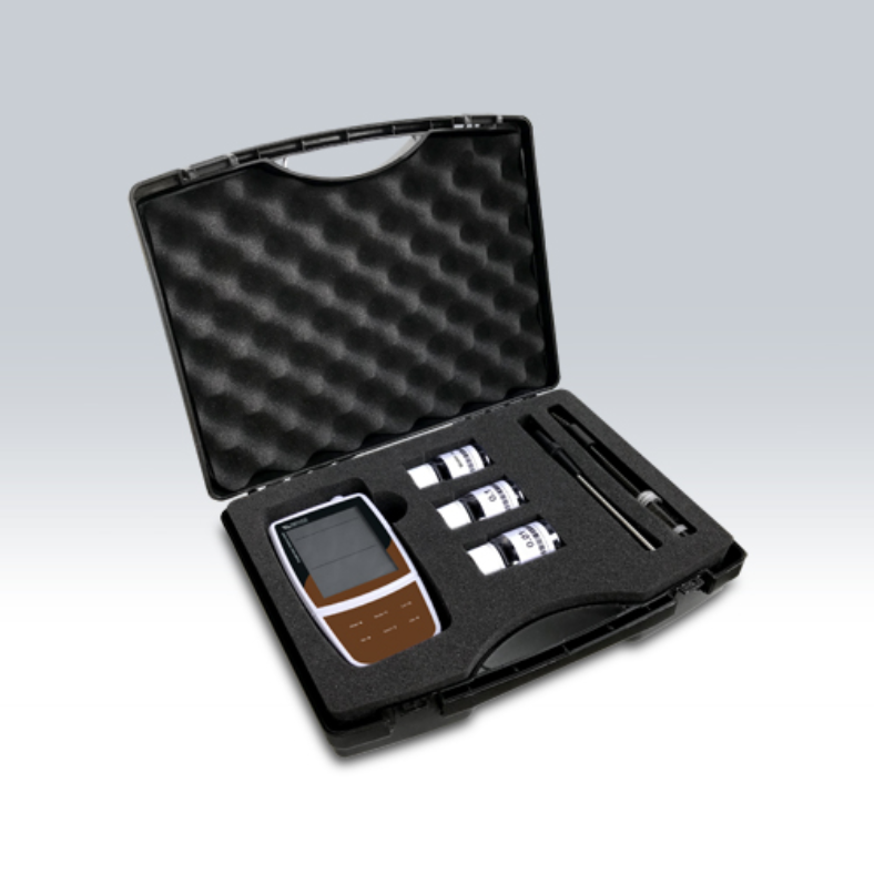 Pilih mode & satuan (mmol/L, mg/L CaCO₃, °dH/°e/°fH); lakukan kalibrasi 2–5 titik (opsi 0,01 / 0,1 / 1 / 10 / 100 mmol/L).